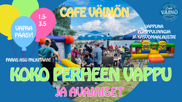 Cafe Väinön avajaisia ja samalla koko perheen vappua vietetään perjantaina 1.5 klo 11-17. Luvassa pomppulinnoja, kasvomaalauksia sekä vappuherkkuja!